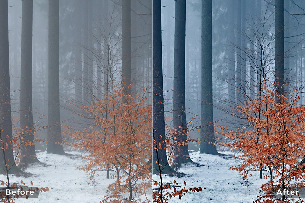 A total of three styles that work well for a variety of forest landscapes of the temperate climate range in all seasons except winter: Dense and dark fir forests, misty coastal woodlands, lush green spring forests or abstract macro details such as lichen, foliage and mushrooms. The special focus is on the green and brown tones of forest vegetation.